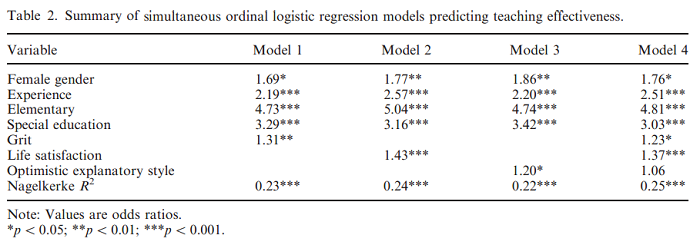 In a simultaneous ordinal logistic regression model predicting effectiveness, only grit and life satisfaction were distinctly predictive.