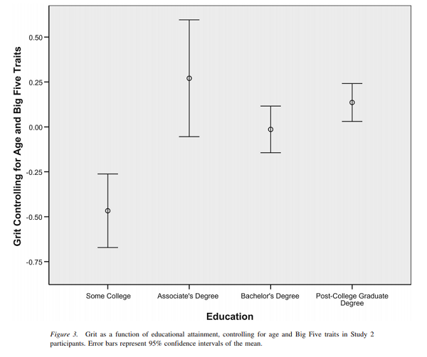 Grit also appeared to increase with age, although this could be because successive generations are less gritty, or because the accumulation of experience drives a increasing belief that one is gritty.