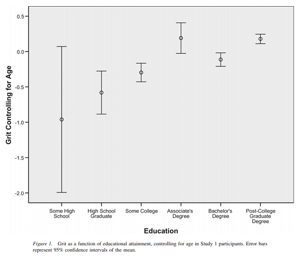In the first study, grittier adults were more likely to have attained a higher level of education. In addition, grit was shown to increase with age, although because this study was correlational and not longitudinal, the result could be born from the cause that successive generations of adults are getting less gritty.