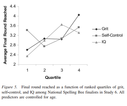 Gritty finalists reached higher rounds, in part because they studied longer. Self-control and verbal IQ also predicted performance, but not as much as grit did.