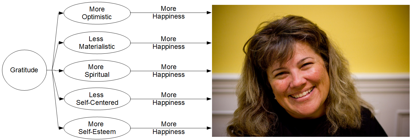 An example of these benefits of gratitude and how they work to improve happiness is illustrated in the image below.